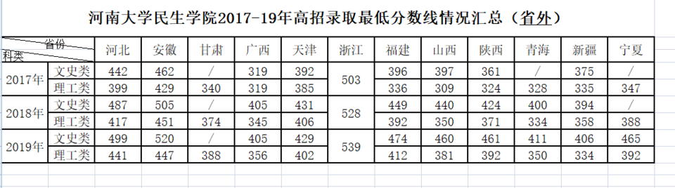 河南大學(xué)民生學(xué)院2017-2019年(外?。╀浫∽畹头?jǐn)?shù)線情況匯總