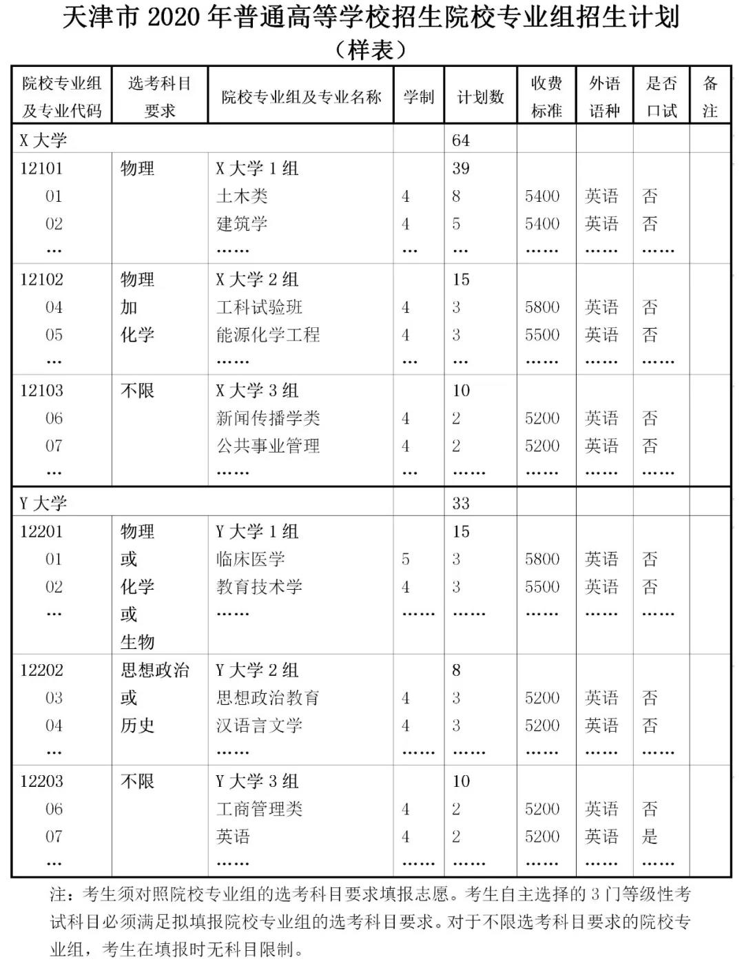 由于2020年各本科院校不同專(zhuān)業(yè)將提出相應(yīng)的選考科目要求,且以院校專(zhuān)業(yè)組方式進(jìn)行投檔,因此各院校也要按專(zhuān)業(yè)組方式編制在津本科招生計(jì)劃。院校在津公布計(jì)劃總額須具體編制到各院校專(zhuān)業(yè)組,院校專(zhuān)業(yè)組的計(jì)劃原則上須具體編制到組內(nèi)各專(zhuān)業(yè)。招生計(jì)劃樣表如下表所示。