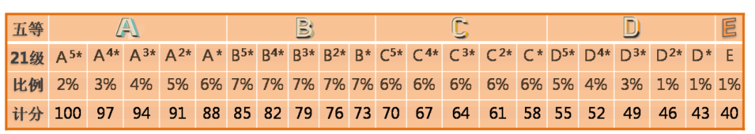 等級(jí)性考試成績(jī)?cè)谟?jì)入高校招生錄取總成績(jī)時(shí),每門(mén)科目成績(jī)由五等細(xì)化為21級(jí),相鄰兩級(jí)之間的分差均為3分。