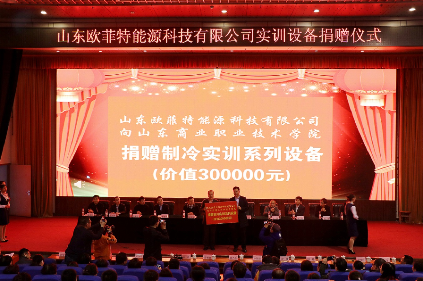 11月20日,山東歐菲特能源科技有限公司實(shí)訓(xùn)設(shè)備捐贈(zèng)儀式在學(xué)術(shù)報(bào)告廳舉行。山東歐菲特能源科技有限公司等7家企業(yè)向我校捐贈(zèng)了價(jià)值30萬的制冷實(shí)訓(xùn)系列設(shè)備,與我校共建了“歐菲特制冷設(shè)備實(shí)訓(xùn)室”,學(xué)校院長(zhǎng)錢乃余代表學(xué)校接受捐贈(zèng)。