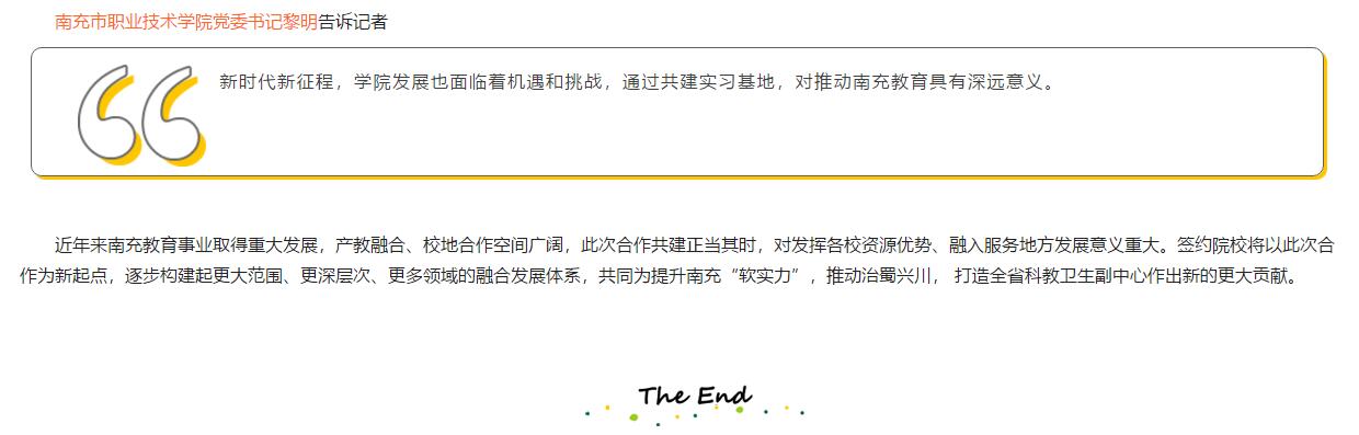 為推動(dòng)南充市教育事業(yè)的高質(zhì)量發(fā)展,助推合作各校融入?yún)^(qū)域經(jīng)濟(jì)發(fā)展全局,7月16日下午,南充職業(yè)技術(shù)學(xué)院與市轄各區(qū)縣小學(xué)幼兒園共建大學(xué)生教育實(shí)習(xí)基地簽約暨授牌儀式舉行。據(jù)悉,簽約院校將在人才培養(yǎng)、師資合作、課題研究、產(chǎn)學(xué)研融合等方面進(jìn)行深化合作與交流。