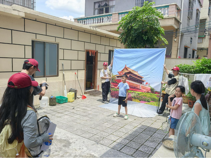 7月12日的暖心回訪,為實(shí)踐畫上溫暖句點(diǎn)。隊(duì)員們將裝著走訪合影的相框送到村民手中,八十歲的奶奶瞇眼細(xì)看后,用粵語笑著招呼“喝茶來”;剝花生的老爺爺摩挲著相框連說“要掛堂屋”。午后,隊(duì)員們將收集的笑臉照片拼貼成心形“笑容墻”,老人的皺紋、孩童的缺牙、書記的欣慰笑靨在陽光下仿佛能聽見碰撞的笑語。偶遇的攝影愛好者用鏡頭記錄下這一幕,畫面里,青年與鄉(xiāng)村的雙向奔赴,正成為“百千萬工程”最鮮活的注腳。
