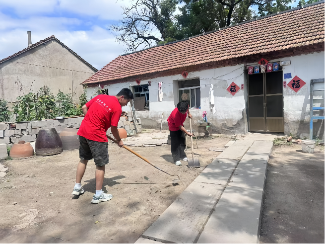 實踐隊首站來到密水街道索家村,這里正在上演一場“志愿+文化”雙驅(qū)模式助力鄉(xiāng)村風(fēng)貌提升的生動實踐。隊員們拿起畫筆,以“綠色發(fā)展,鄉(xiāng)村振興”為主題,在斑駁的墻面上揮灑創(chuàng)意。昔日單調(diào)的墻面漸漸“煥新”——田間的麥浪、孩童追逐的笑臉、象征夢想的翅膀與索家村特色面食產(chǎn)業(yè)等本地民俗元素交相輝映,一幅幅栩栩如生的壁畫讓村莊煥發(fā)新生機(jī)。“這些年輕人真是太有心了,把我們的村子畫得這么漂亮,看著就讓人心里舒坦!”路過的村民紛紛駐足贊嘆。除了美化村容,隊員們還化身為青年志愿者,走村入戶開展貼心服務(wù)。他們走進(jìn)獨居老人家中,打掃院落衛(wèi)生、陪老人翻看老照片、聊敘村里新變化;穿梭在村道小巷,清理雜草雜物、規(guī)整農(nóng)具柴堆,讓村容村貌更加干凈整潔。在實踐中,隊員們深刻體會到:“鄉(xiāng)村振興不僅是環(huán)境的變化,更是人心的凝聚。只有真正融入基層,才能理解鄉(xiāng)親們的所思所想所盼。
