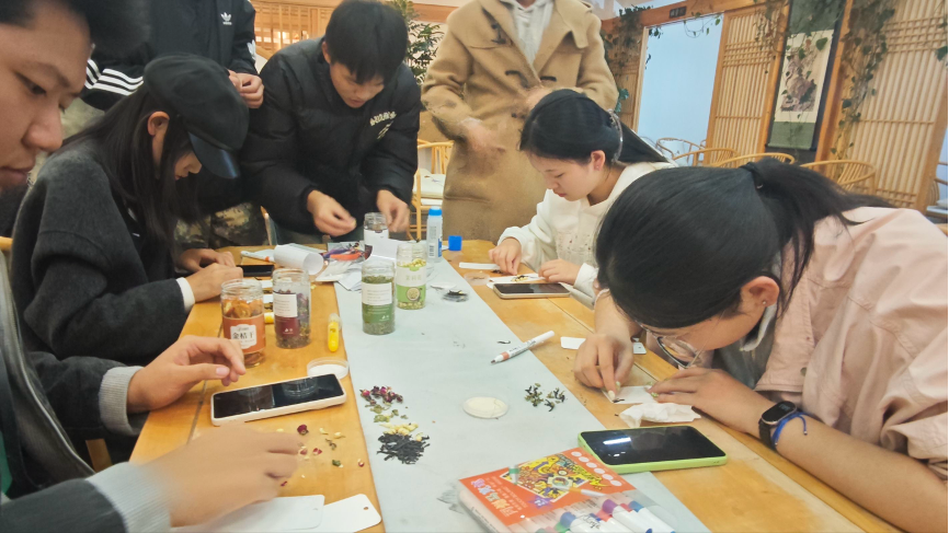 系列活動壓軸的 “一葉知詩?茗香留痕” 書簽制作,讓傳統(tǒng)文化體驗更具情感溫度。基地創(chuàng)作區(qū)里,學生發(fā)揮想象,從基地提供的茶葉、干花、葉片中選材,在書簽底板上構圖,或配古典詩詞,或寫心靈寄語,將對茶文化的理解與生活感悟凝注于方寸間。這些手作藝術品既展現(xiàn)學生美育能力,更成為情緒疏導、心靈沉淀的載體,幫助學業(yè)繁忙的學生慢下來,感受手作療愈溫度。