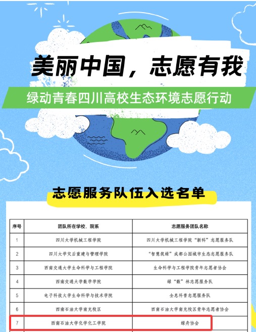 近日,由四川省生態(tài)環(huán)境廳與共青團四川省委聯(lián)合開展的“美麗中國,志愿有我——綠動青春四川高校生態(tài)環(huán)境志愿行動”入選名單公布,西南石油大學綠舟協(xié)會成功入圍(全省共50支隊伍),將在2025年3月至6月期間,聚焦生態(tài)環(huán)保主題開展系列志愿服務活動,為生態(tài)文明建設注入青春動能。