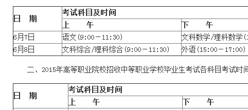 一、2015年普通高等學(xué)校招生統(tǒng)一考試各科目考試時(shí)間安排
