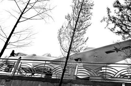 近日下午,記者在武漢生物工程學(xué)院機(jī)電學(xué)院門口見到這架戰(zhàn)斗機(jī)。戰(zhàn)斗機(jī)被放置在學(xué)院門口一間平房頂上,因?yàn)檫€沒裝好,工人用篷布將戰(zhàn)斗機(jī)正面遮了起來 (如圖),一些學(xué)生只能從平房背后仰視飛機(jī)“尊容”。