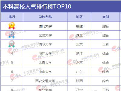 4月16日,中國(guó)教育在線發(fā)布“2015年最具人氣大學(xué)排行榜3月榜TOP10”名單,其中,廈門(mén)大學(xué)穩(wěn)居本科高校榜首,成為3月份最受關(guān)注的本科高校。武漢大學(xué)、清華大學(xué)分列第二、三名,北京大學(xué)北京大學(xué)排第五。南華大學(xué)排第十,在??聘咝E判兄?,遼寧省交通高等專科學(xué)校、蕪湖職業(yè)技術(shù)學(xué)院、哈爾濱鐵道職業(yè)技術(shù)學(xué)院成為考生關(guān)注的前三甲。