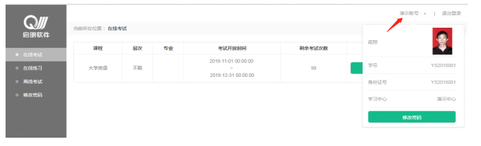 在考試列表頁(yè),點(diǎn)擊右上方的考試姓名,可以看到個(gè)人信息列表,如下圖所示,點(diǎn)擊“修改密碼”按鈕,可修改考生登錄密碼。