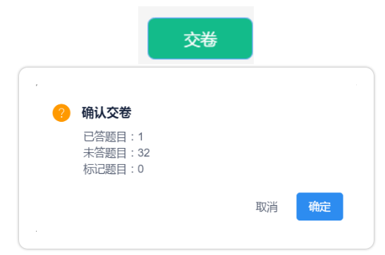④作答完成后點(diǎn)擊右上角“交卷”彈出確認(rèn)界面,點(diǎn)擊確定即可交卷完成本次考試。