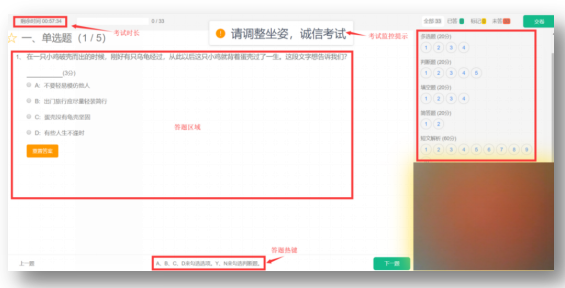 一般為應(yīng)考用電腦自帶攝像頭或外置攝像頭,保證攝像頭位于考生正前方且能夠清晰拍攝到考生完整上半身??忌鷳?yīng)穿著得體,不得佩戴帽子、口罩、墨鏡等,不可遮擋耳部,不得佩戴耳飾或耳機(jī)。開考后,考生不得離開攝像范圍,同時(shí)注意坐姿及動(dòng)作,保證面部和上半身在考試全程均處于攝像頭范圍內(nèi)。否則,系統(tǒng)將判定存在疑似違紀(jì)行為,拍照留存。