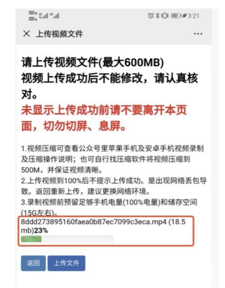 在視頻上傳進(jìn)行時(shí)(顯示進(jìn)度條),請(qǐng)不要點(diǎn)擊任何按鈕,直至上傳結(jié)束。上傳之后若重新點(diǎn)擊上傳按鈕會(huì)顯示“已經(jīng)完成視頻上傳”,一旦提示上傳成功,無(wú)法撤銷和二次上傳,所以只有一次上傳成功的機(jī)會(huì),未上傳成功可多次上傳,直至上傳成功為止。