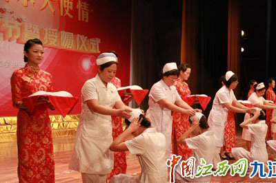 5月12日是國際護士節(jié)。每年的這一天,該院都會舉行授帽儀式?!拔覀儾⒉皇呛唵蔚貙⒆o士帽給學生戴上”,朱慧芳告訴記者。為了讓這授帽儀式變得更有意義,該院不僅邀請九江市各大醫(yī)院資深的護理工作者到場為學生授帽,還請學生家長到學校共同見證孩子的授帽儀式。