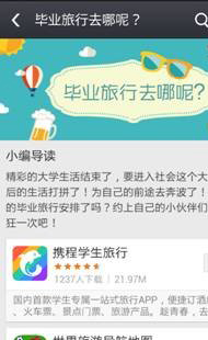 “畢業(yè)旅行”專題應(yīng)用:攜程學(xué)生旅行、世界旅游導(dǎo)航地圖、在路上、墨跡天氣、旅游攻略、鐵路12306、去哪兒旅行、航班管家、窮游、馬蜂窩。