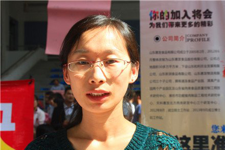 品檢測及管理專業(yè)的畢業(yè)生于潔麗也來到了招聘現(xiàn)場,不過她不是來找工作的,她已經(jīng)與臨沂金鑼簽約,這次是作為學生代表來招聘。她介紹,2014年5月份她