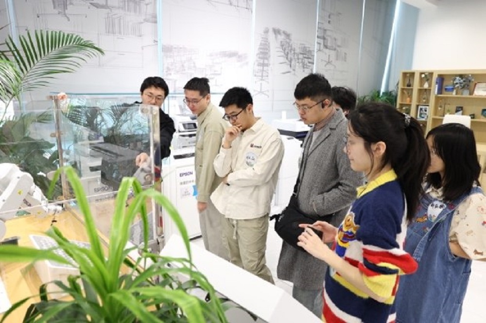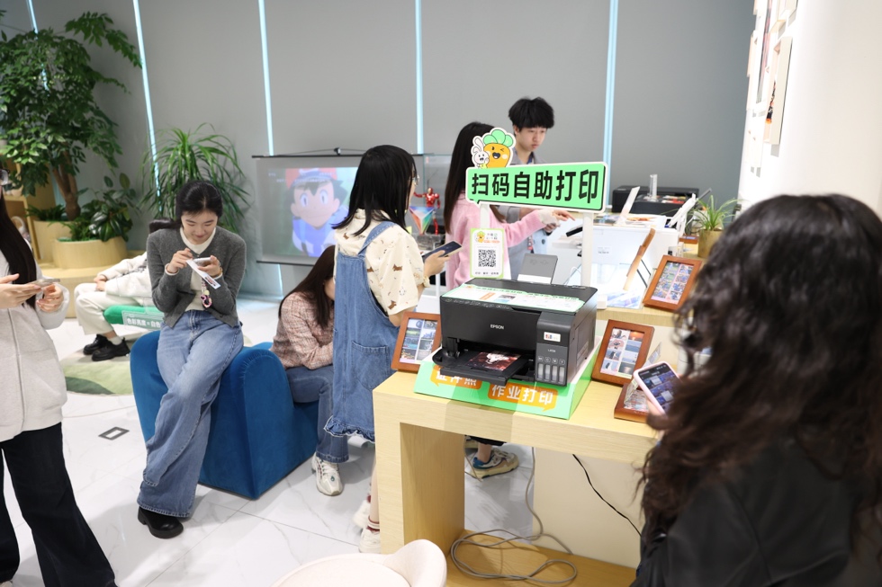 本屆訓練營,愛普生邀請同學們走進愛普生(中國)有限公司北京總部,在展廳中更全面地參觀與體驗全線產(chǎn)品及方案:通過“愛蘿卜打印”輸出“人生四格照”,了解愛普生噴墨打印技術無需加熱的綠色文印優(yōu)勢;觸摸欣賞數(shù)碼印花服飾與家居裝飾品,感受其背后的環(huán)保性能與個性化定制價值;與愛普生機器人對弈象棋,體驗前沿智能化技術方案;借助愛普生高亮激光工程投影機,沉浸式感受文旅方案的魅力……這些豐富多元的創(chuàng)新方案,以獨特的綠色價值,為同學們帶來了連連驚喜。